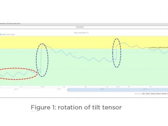 Systém bol nakonfigurovaný tak, aby odosielal aktualizácie v 30-minútovom cykle a odosielal e-mailové/SMS upozornenia v prípade prekročenia prahových hodnôt. Výsledné údaje naznačovali „vlnový“ vzorec pohybu súvisiaci s denným cyklom otepľovania a ochladzovania (zakrúžkované červenou farbou na obrázku 1). Bolo však tiež zrejmé, že existoval trend naznačujúci rozdielny pohyb jedným smerom (zakrúžkované modrou farbou na obrázku 1). Obrázok 1 znázorňuje, ako pohyby dvakrát prekročili žltý prah výstrahy.